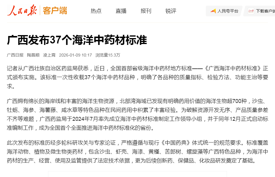 广西拥有绵长的海岸线和丰富的海洋生物资源,北部湾海域已发现有明确药用价值的海洋生物超700种,沙虫、牡蛎、海参、海薯藤、咸水草等特色品种在民间药用中积累了丰富经验。为破解资源开发无序、产品质量参差不齐等难题,广西药监局于2024年7月率先成立海洋中药材标准制定工作领导小组,并于同年12月正式启动标准编制工作,成为全国首个全面推进海洋中药材标准化的省份。