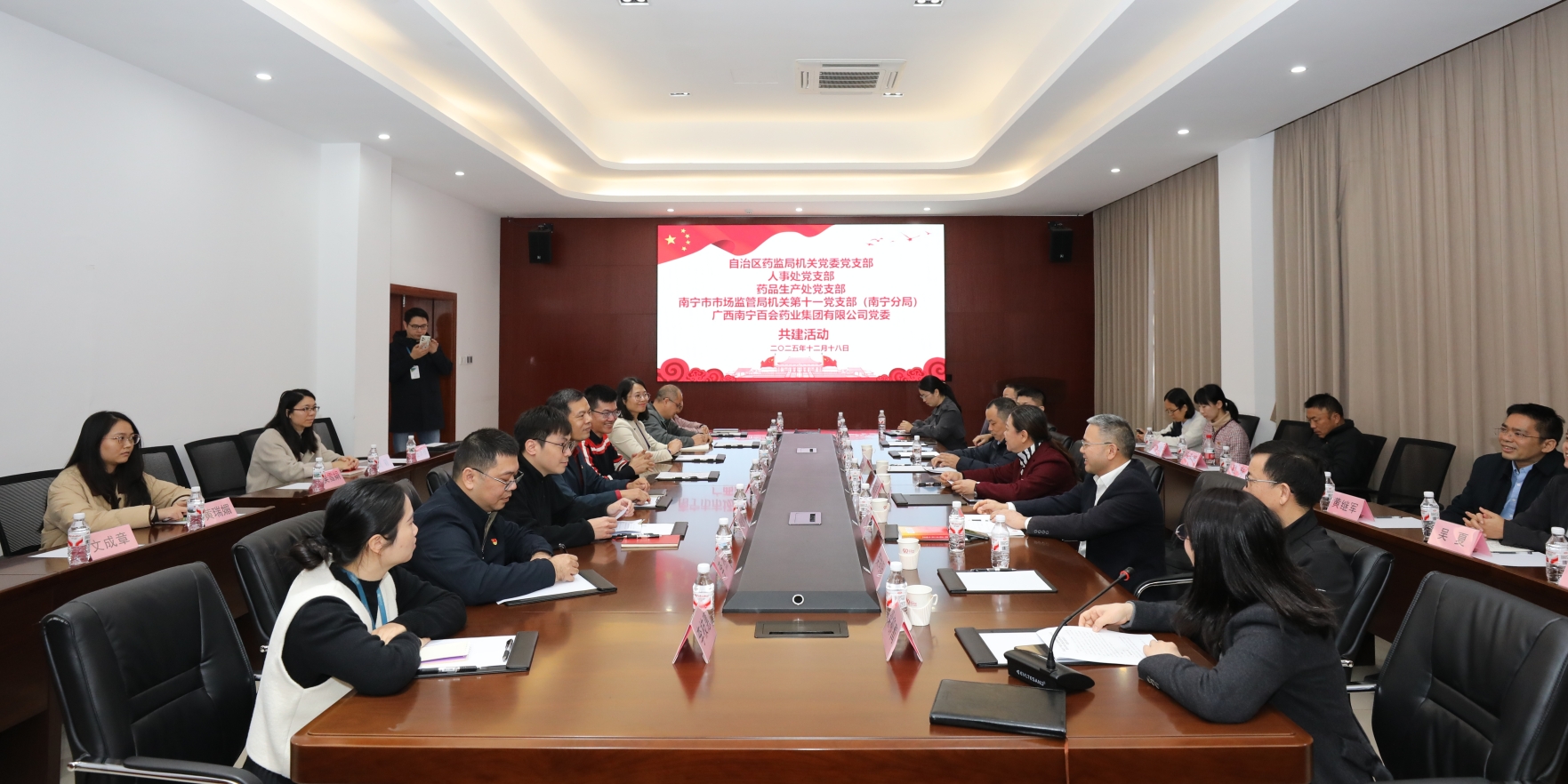 2025年12月18日,为深入贯彻党的二十届四中全会精神,巩固拓展深入贯彻中央八项规定精神学习教育成果,落实国际志愿者日主题活动要求,探索机关党组织与药品行业党组织联建模式,拓展丰富主题党日形式和内容,推进医药企业诚信文化建设,加强药品安全社会共治, 沙巴体育药品生产监管处、人事处、机关党委3个处室党支部联合南宁检查分局全体党员,与南宁百会药业集团有限公司(以下简称“百会药业”)党委、南宁海王健康生物科技有限公司(以下简称“海王生物”)党支部结对开展“汇聚志愿力量 共建美好社会”暨“党建引领·同心共筑药品安全”主题志愿者日暨主题党日联建活动。